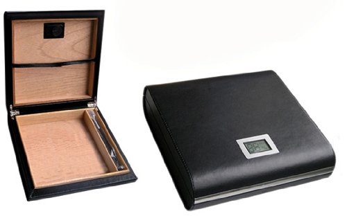 The Aspen leather 20 count cigar humidor is the ideal travel humidor with all the convenience! Crafted of quality black leather with black matching stitching, the Aspen's clean design has made it one of the most popular portable "take along" humidors in our line. On the underside of its lid, this humidor features a section to store your cigars and to simultaneously secure them with a built-in leather strap. The main storage section includes an adjustable divider and strip style humidifier. Once closed, the lid is secured through a set of built-in recessed magnets. One of the Aspen's signature features is its built-in, recessed external digital hygrometer. Just a quick glance at the digital display lets you know your cigars are always at the right humidity level.Available at Amazon Check Price Now!
